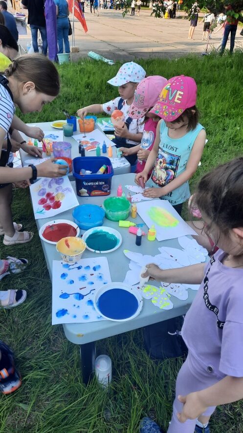 Для детей-участников мероприятия была организована интерактивная площадка «Юный художник». Каждому желающему были предложены акварельные краски, кисти и бумага для рисования на тему «Лето, солнце и бабочки».